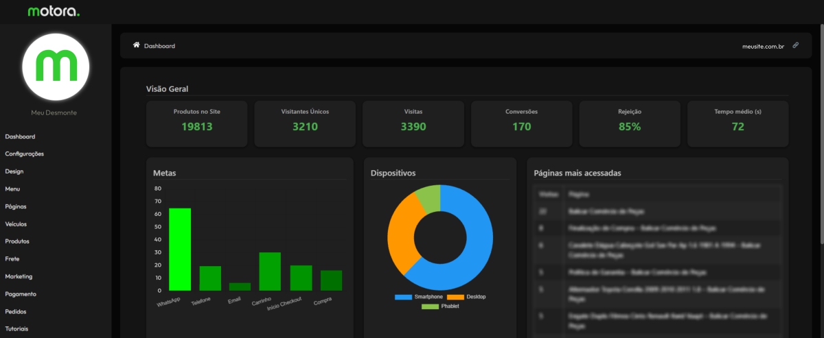 A Plataforma Motora é o centro de comando da sua loja: você administra tudo em um único painel — métricas (visitas, conversões, rejeição, tempo médio), configurações do site (identidade visual, menu, páginas, banners, popup) e regras de automação para operar com segurança e escala, com foco especial em Mercado Livre e notificações.