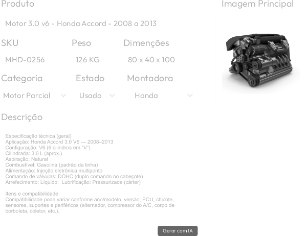 Relacione peças a veículos quando fizer sentido, edite descrições com um editor completo e utilize recursos de IA para agilizar textos sem perder padrão. As imagens são gerenciadas de forma individual, com envio e remoção simples.